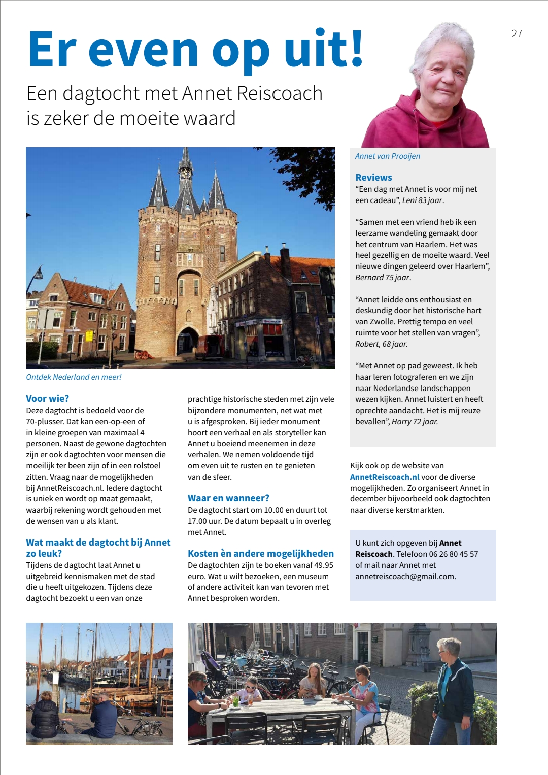 Annet Reiscoach is een jonge reisorganisatie die zich richt op de 70-plussers die graag een dagje uit willen en al een jarenlange ervaring heeft opgebouwd in het enthousiast en persoonlijk begeleiden van deze groep.